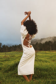 Below the knee length dress with sophisticated puffed sleeves, an open back, and square neckline.
